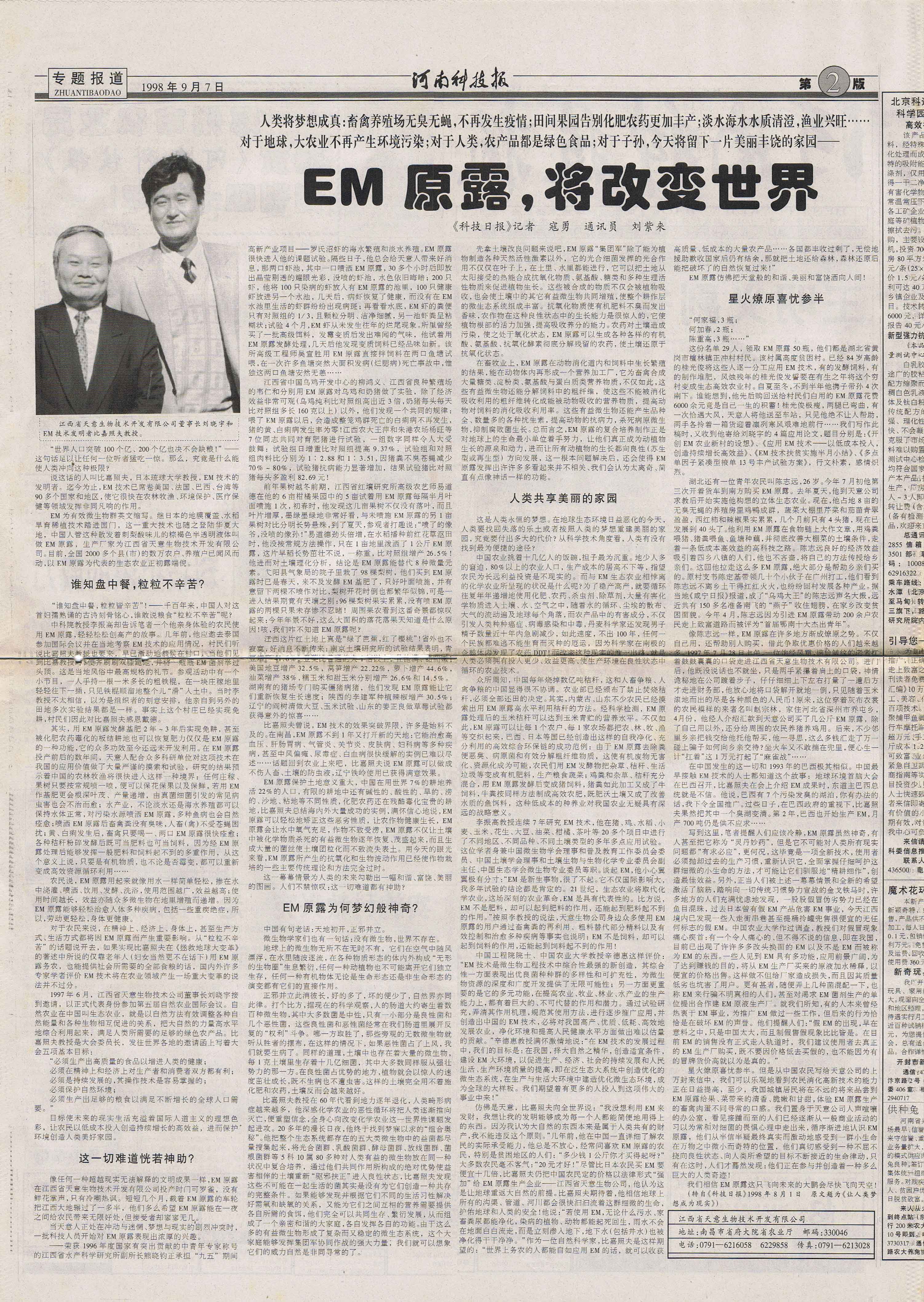 1997 1997年,継《中國畜牧水產報》、《科技日報》、《經濟參考報》、《江西日報》等媒體發表長篇通訊《EM原露正在改變世界》,各省科技、農業報刋均紛紛轉載,EM原露在江西最初的使用效果迅速在全國范圍內興起了一股熱潮,兩年內共簽定縣級代理合同500余家。